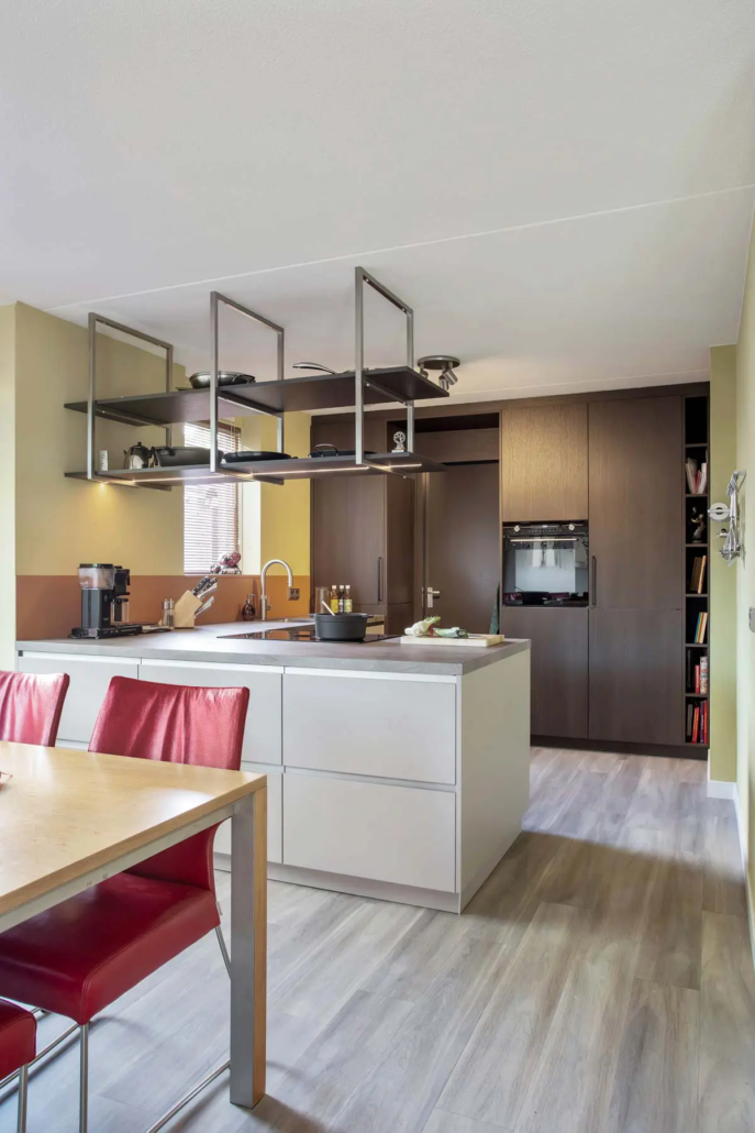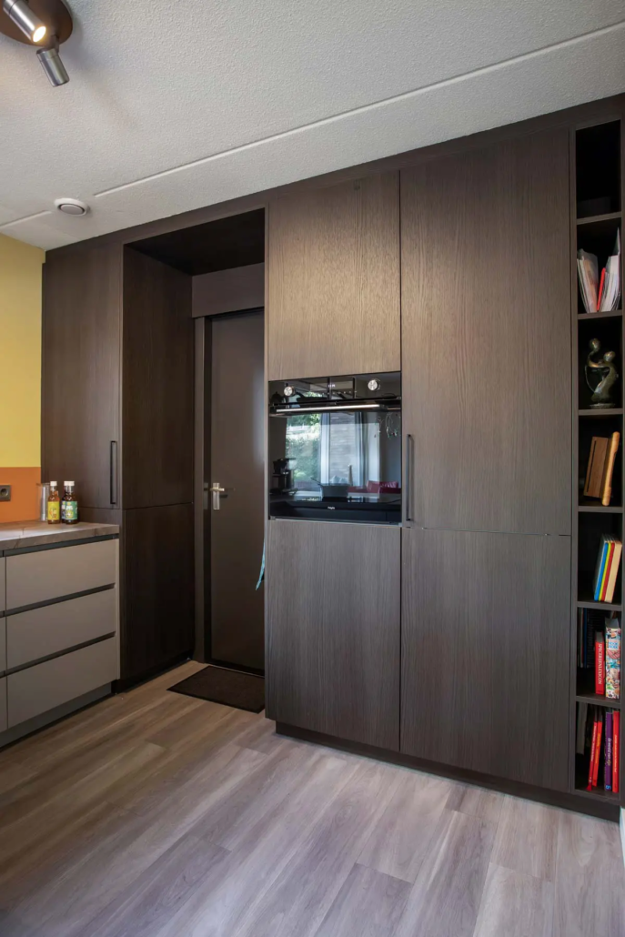 Qua stijl liet Irma zich overtuigen. “Ik wilde helemaal geen donker hout, ik heb zelfs gekeken naar goudkleurige of rode keukens. Maar Lowie heeft me overtuigd dat rustige tinten veel mooier zouden passen. Het donkere hout geeft juist heel veel rust, zeker omdat de rest van de kamer heel licht is met grote ramen. Daar ben ik achteraf heel blij mee.”