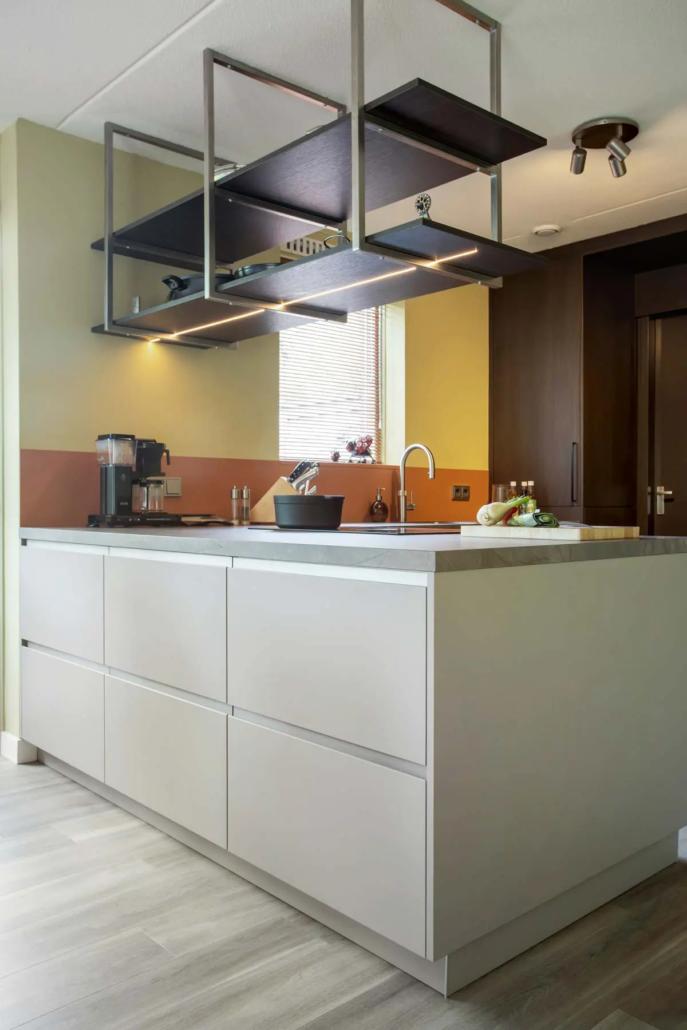 Het eerste ontwerp bleek te groot en ingrijpend. “Lowie had een heel groot ontwerp gemaakt met een enorm eiland en zelfs een voorstel voor extra ramen”, legt Irma uit. “Voor ons was dat te heftig. Uiteindelijk hebben we het ontwerp kleiner gemaakt, maar nog steeds met veel van zijn creatieve ideeën. We hebben bijvoorbeeld een regaal van hetzelfde materiaal als de achterwand. Daar hou ik van: dat alles klopt en mooi bij elkaar past.”