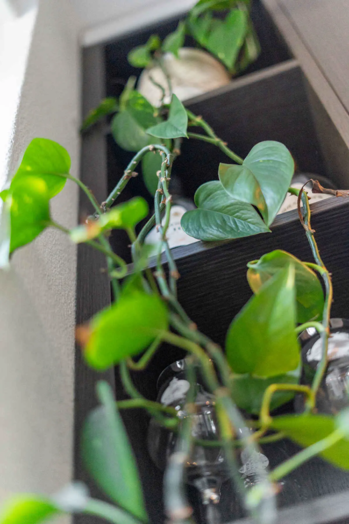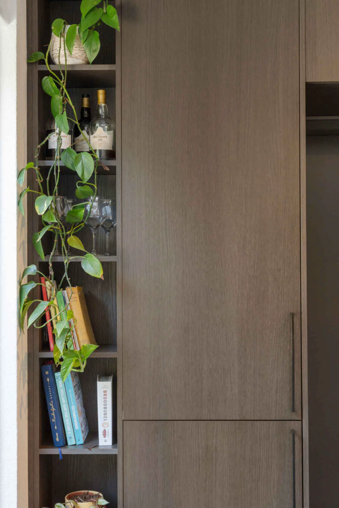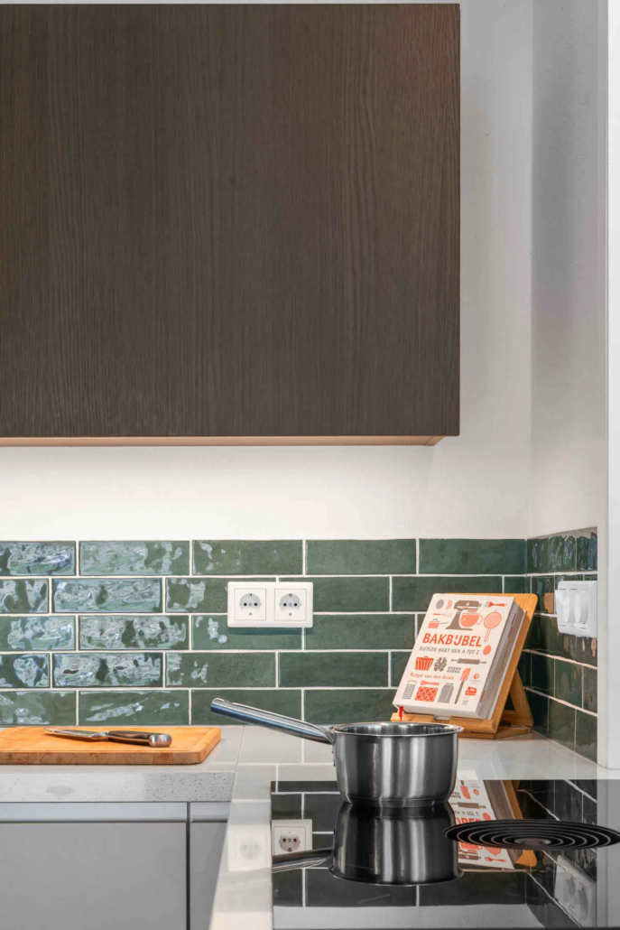 “Eigenlijk is bijna alles wat Lowie heeft voorgesteld erin gekomen”, vertelt Elske. “Alleen het stenen werkblad hebben we zelf uitgezocht in de showroom. Verder zijn de lage kastjes in een lichte tint en heeft de kastenwand een donkere houtlook, die weer terugkomt in de zwevende bovenkasten. Ook de open vakken links in de kastenwand met stopcontact waren zijn idee, zodat we daar kookboeken kwijt kunnen of de telefoon kunnen opladen. In zijn ontwerp is alles functioneel en mooi weggewerkt.”
