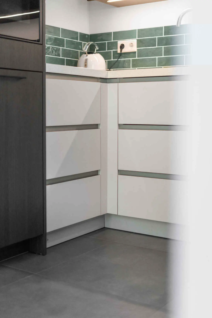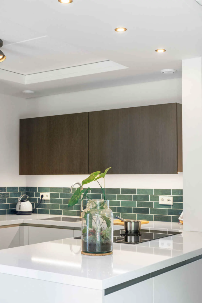 “We hadden bij andere keukenzaken het gevoel dat je zelf alles moest aandragen, maar bij Lowie was dat heel anders”, legt Elske uit. “Hij zei: ik kom gewoon bij jullie langs, kijk bij jullie rond, ik ga met jullie praten en dan ontwerp ik iets dat bij jullie stijl, behoeftes en jullie huis past. Dat gaf meteen een frisse blik. Wij hadden zelf al allerlei dure oplossingen bedacht om een deur in het ontwerp weg te werken, maar Lowie’s oplossing was simpel: maak de deur onderdeel van de kastenwand, dan valt hij mooi weg. Dat scheelde enorm in de kosten.”