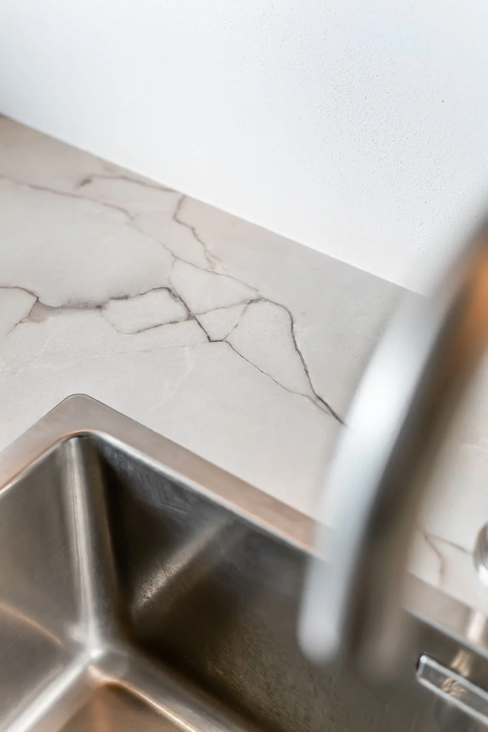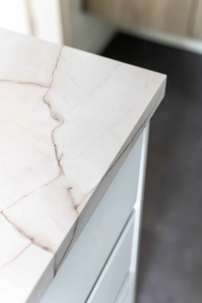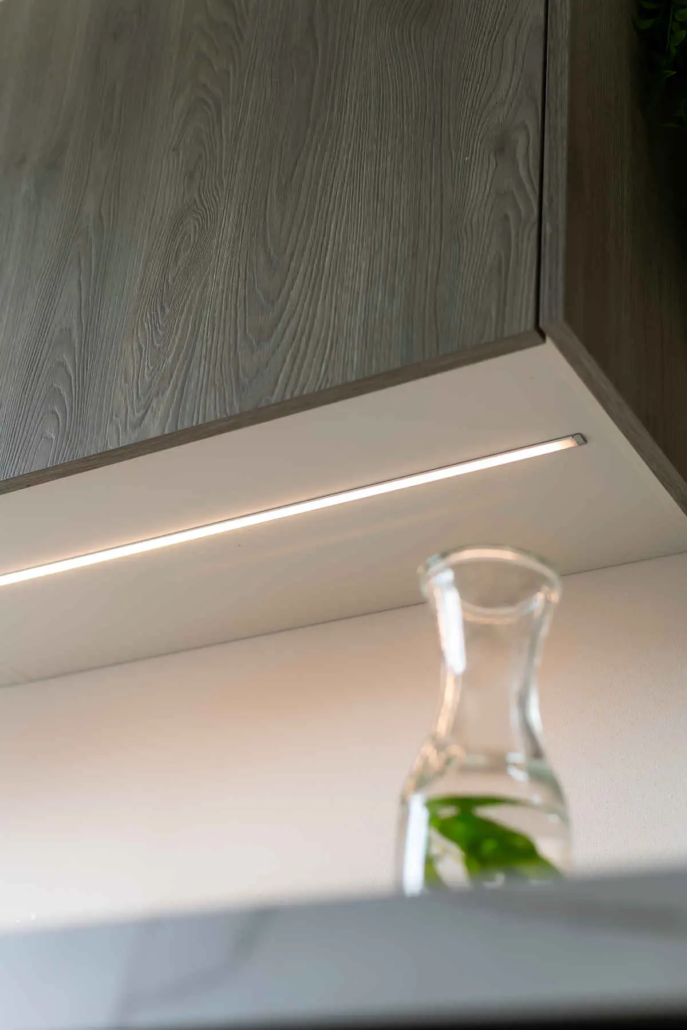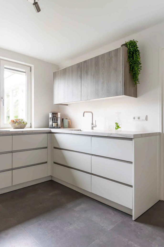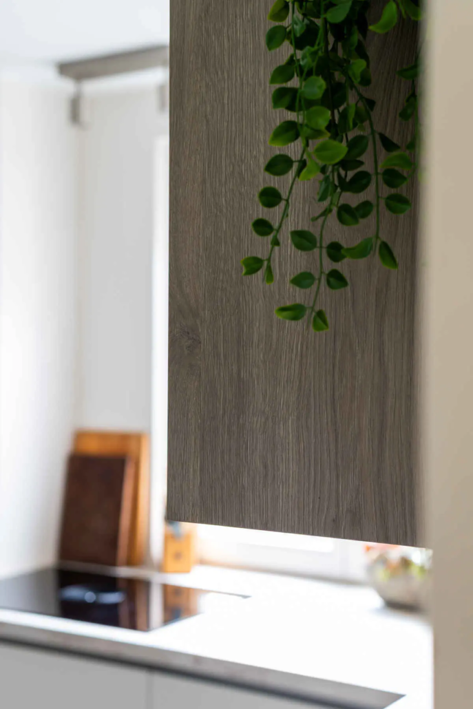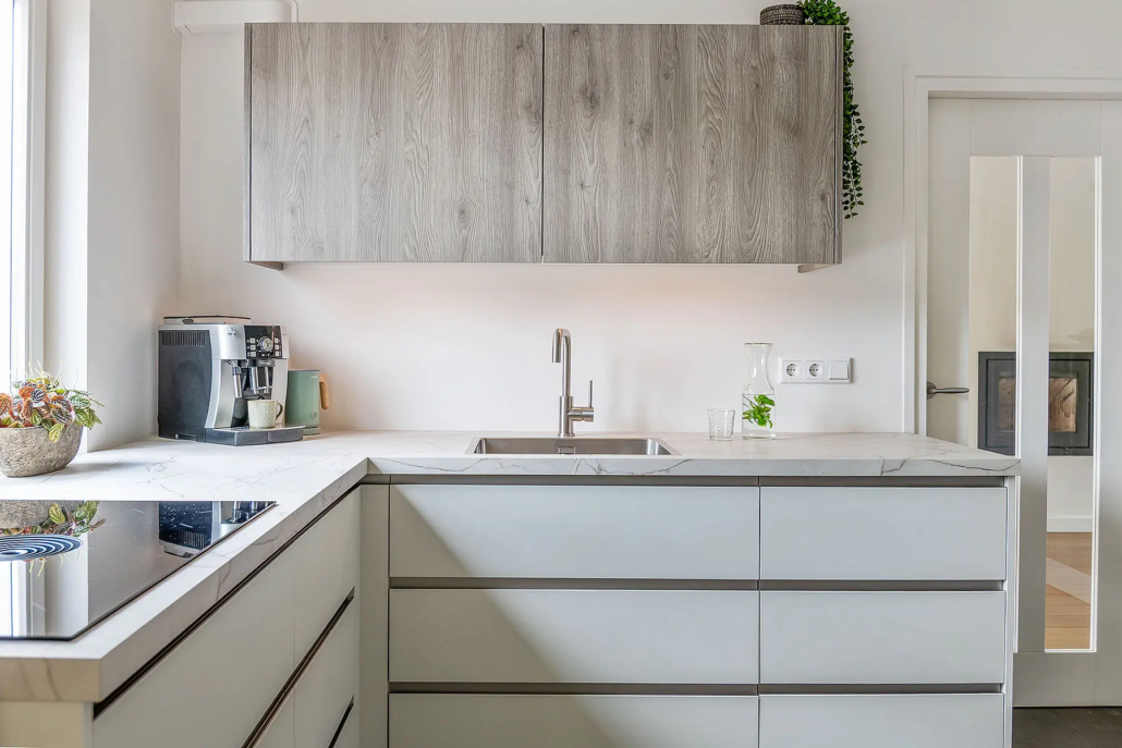 “We zijn vrij blanco naar de showroom gegaan”, vervolgt Wim. “Ter plekke besloten we voor de combinatie met lichte kleuren en hout. Een licht ontwerp past bij ons en de houtkleuren kwamen uit de koker van Lowie. Tenslotte hebben we gekozen voor een marmerlook werkblad.”