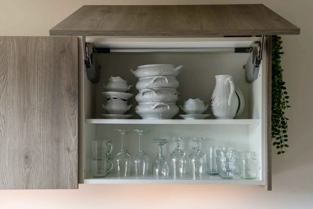 “We hebben vanuit de keuken een heel mooi zicht op de tuin, dus daar wilden we het kookblok of de afwasbak plaatsen. Tijdens het koken kijken we dan heerlijk naar buiten. Verder wilden we veel kastruimte. We hebben wel een kelder, maar we wilden zoveel mogelijk boven neerzetten zodat we niet steeds de trap op en af hoeven te lopen. Het resultaat is een volledige wand met kasten, oven, koelkast en magnetron. Daar stond eerst de keukentafel. Het is nu veel praktischer en is helemaal in de muur weggewerkt.”