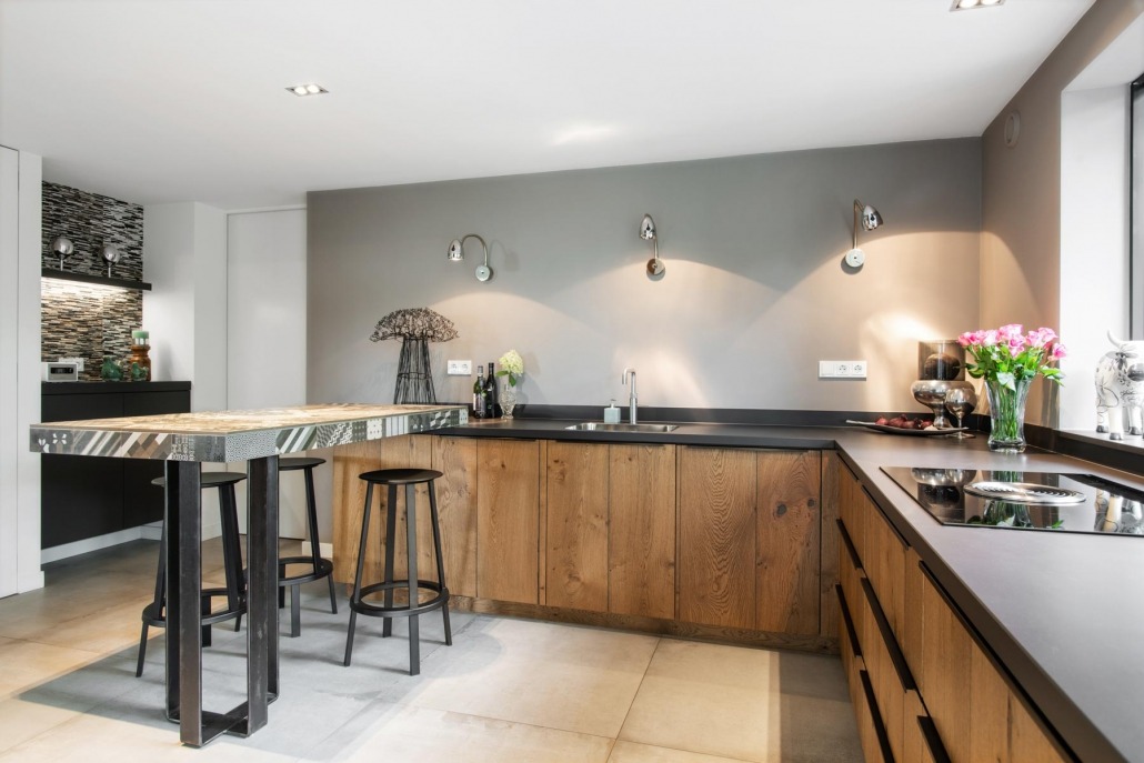 De moderne houten keuken heeft industriële accenten. Het geheel is harmonieus doordat de materialen en kleuren op elkaar zijn afgestemd. Zo zijn onder meer de houtblokjes aan de wand bij het koffiehoekje van eenzelfde kleur als de tegels van de bar. ‘De keuken past daardoor uitstekend bij ons huis en interieur. Dat is belangrijk omdat de keuken de woonkamer met de tuinkamer verbindt.’
