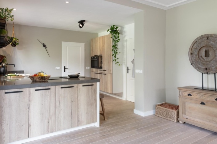 Ze wilden een houtkleurige keuken, hoewel ze het aanvankelijk spannend vonden: zou de houten keuken op de houten vloer wel mooi uitkomen? Toen ze een staal van de fronten (wildeiken) mee naar huis kregen van Verkoelen Keukens waren ze gerustgesteld: de houttinten verschilden voldoende van elkaar en daarbij zorgden de witte zijkanten van de kasten en de witte plinten voor extra contrast. Dat geldt ook voor het donkere keukenblad van composiet. ‘Een topkeuze’, vinden ze. ‘Heel fijn in het onderhoud.’