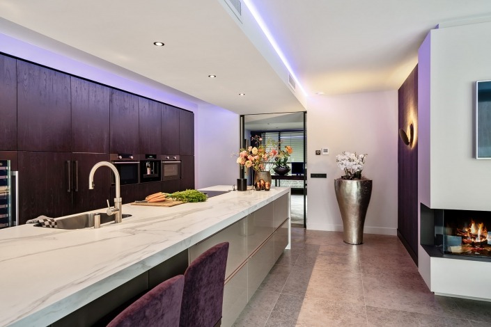 De inbouwwand, in zwarte houtlook, zit boordevol gebruiksgemak. Met twee ovens en een koffiemachine mooi in lijn en een dubbele wijnklimaatkast. In het kookeiland zitten ook twee afwasmachines. ‘Ideaal’, zo is Marinka enthousiast. ‘Dat kunnen we iedereen aanbevelen.’