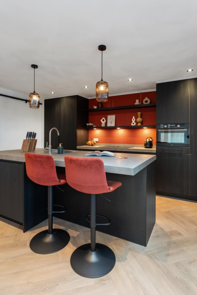 Zouden een zwarte kastenwand én een zwart kookeiland er niet een té zwarte keuken van maken, vroegen ze zich aanvankelijk af. Het interieur is echter licht genoeg en er valt voldoende licht van buiten binnen. De zwarte houtnerf brengt daardoor juist warmte en ambiance en dat is fijn, want Silke en Jeffrey zitten graag aan het barhoekje. ‘We hebben bewust gekozen voor de bar op de hoek van het eiland. Dan zit je gezelliger dan naast elkaar.’